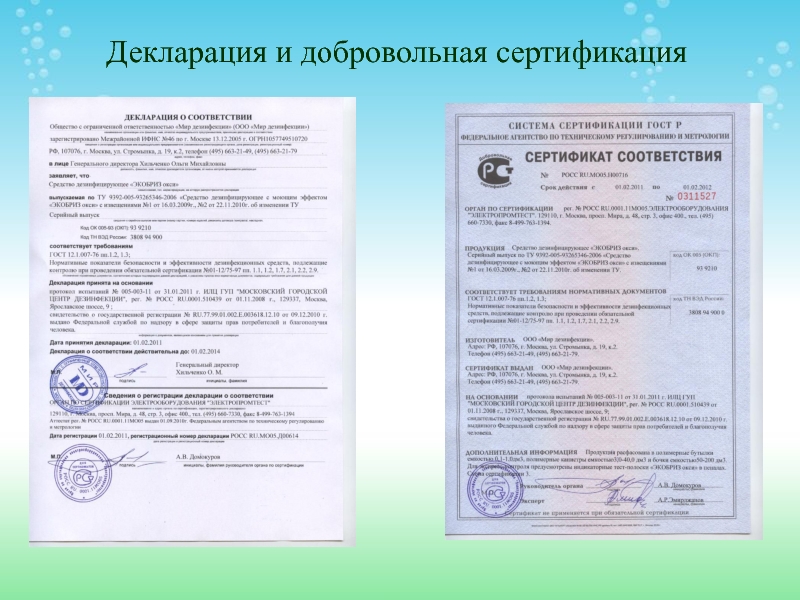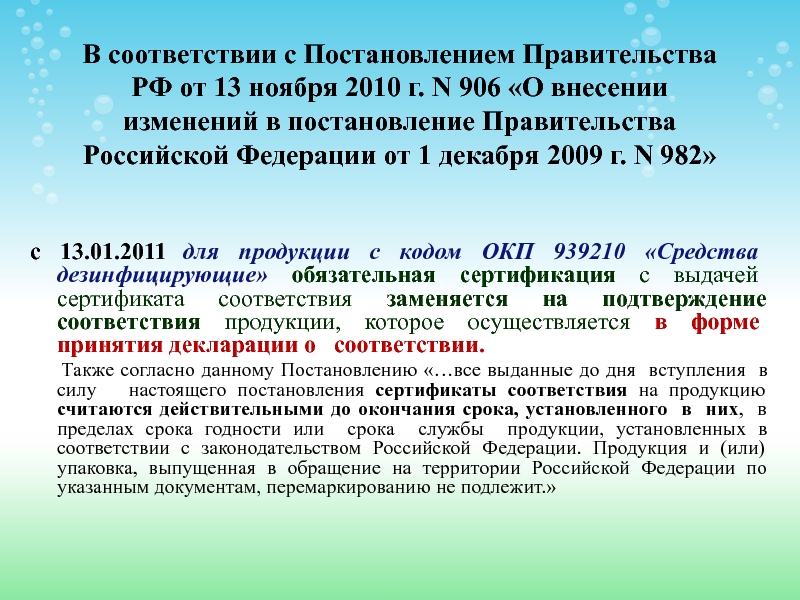 с 13.01.2011 для продукции с кодом ОКП 939210 «Средства дезинфицирующие» обязательная сертификация с выдачей сертификата соответствия заменяется на подтверждение соответствия продукции, которое осуществляется в форме принятия декларации о соответствии.