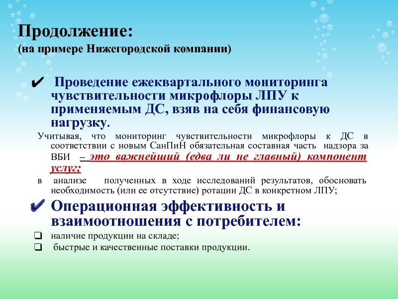 что мониторинг чувствительности микрофлоры к ДС в соответствии с новым СанПиН обязательная составная часть надзора за ВБИ – это важнейший (едва ли не главный) компонент услуг;