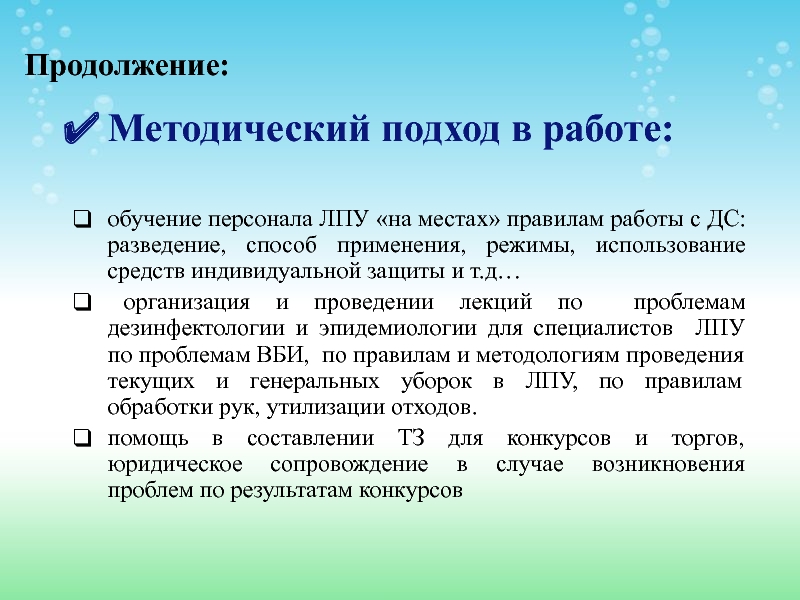 организация и проведении лекций по проблемам дезинфектологии и эпидемиологии для специалистов ЛПУ по проблемам ВБИ, по правилам и методологиям проведения текущих и генеральных уборок в ЛПУ, по правилам обработки рук, утилизации отходов.