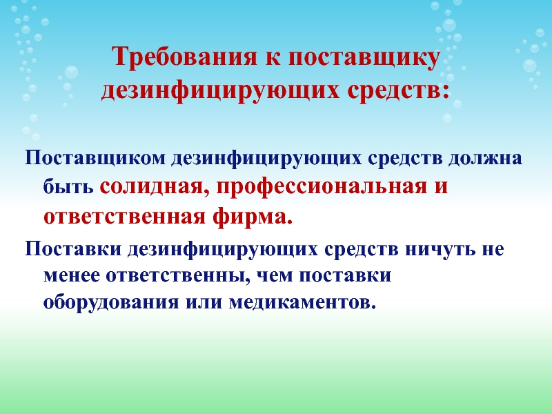 Слайд 45Требования к поставщику дезинфицирующих средств:
