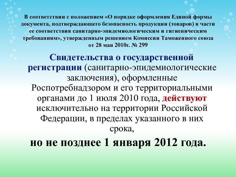Свидетельства о государственной регистрации (санитарно-эпидемиологические заключения), оформленные Роспотребнадзором и его территориальными органами до 1 июля 2010 года, действуют исключительно на территории Российской Федерации, в пределах указанного в них срока,