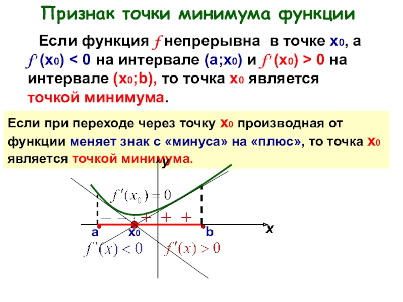 Если при переходе через точку х0 производная от функции меняет знак с «минуса» на «плюс», то точка х0 является точкой минимума.