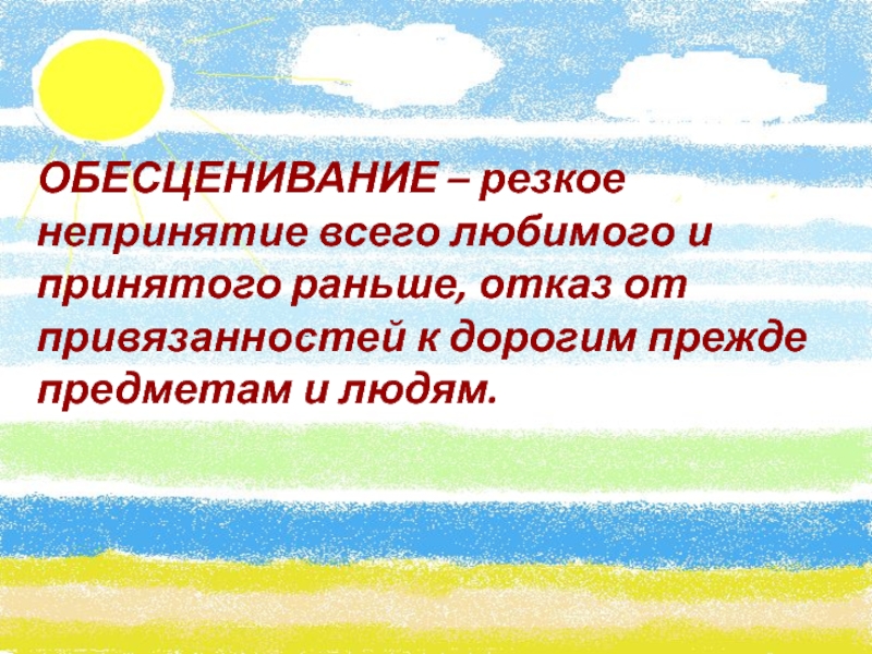 Слайд 12ОБЕСЦЕНИВАНИЕ – резкое непринятие всего любимого и принятого раньше, отказ