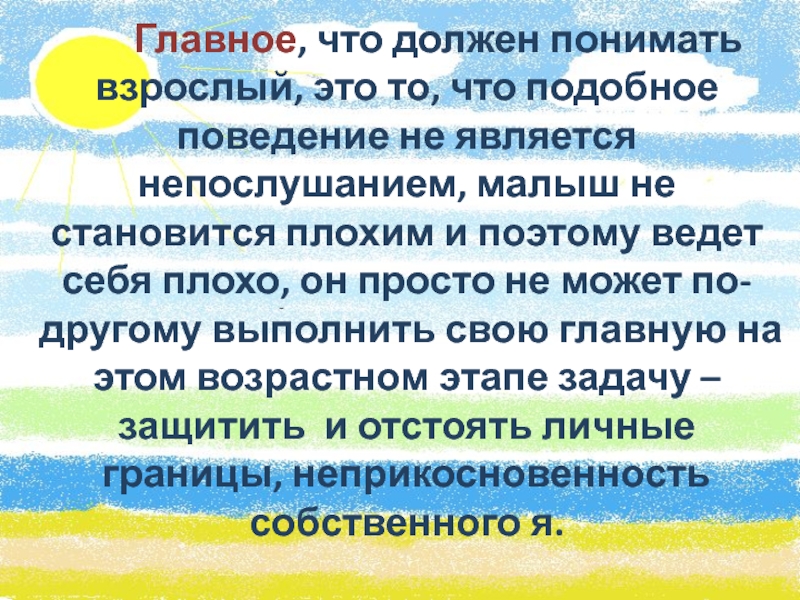 плохим и поэтому ведет себя плохо, он просто не может по-другому выполнить свою главную на этом возрастном этапе задачу – защитить и отстоять личные границы, неприкосновенность собственного я.