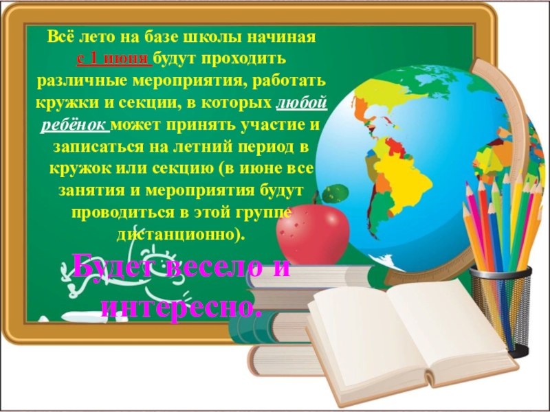 ребёнок может принять участие и записаться на летний период в кружок или секцию (в июне все занятия и мероприятия будут проводиться в этой группе дистанционно).Будет весело и интересно.