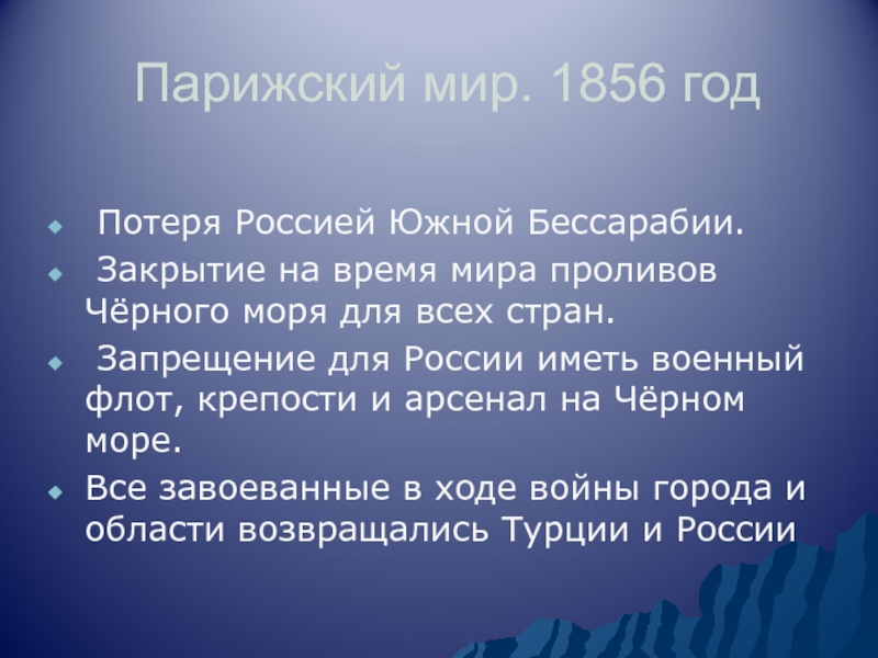 Парижский мир. 1856 год Потеря Россией Южной Бессарабии. Закрытие на время мира проливов Чёрного моря для всех
