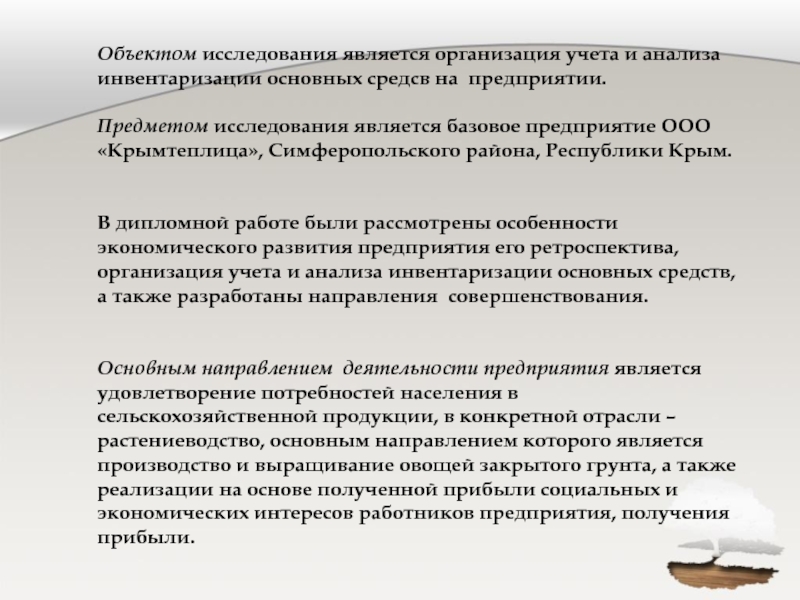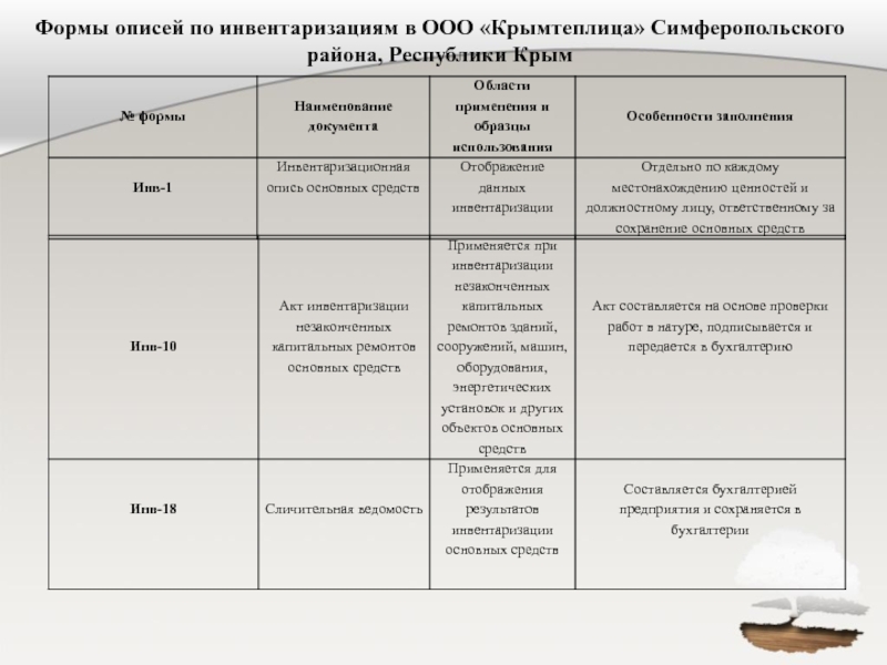 АНАЛИЗ ИНВЕНТАРИЗАЦИИ ОСНОВНЫХ СРЕДСТВ»на примере: ООО «Крымтеплица», Симферопольского района,