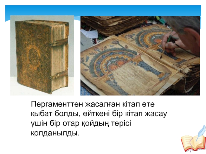 Пергаменттен жасалған кітап өте қыбат болды, өйткені бір кітап жасау үшін бір отар қойдың терісі қолданылды.