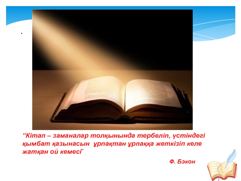 . “Кітап – заманалар толқынында тербеліп, үстіндегі қымбат қазынасын ұрпақтан ұрпаққа жеткізіп келе жатқан ой кемесі”Ф. Бэкон