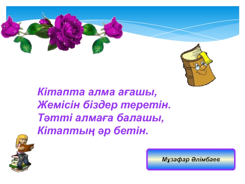 Кітапта алма ағашы,Жемісін біздер теретін.Тәтті алмаға балашы,Кітаптың әр бетін.Мұзафар Әлімбаев