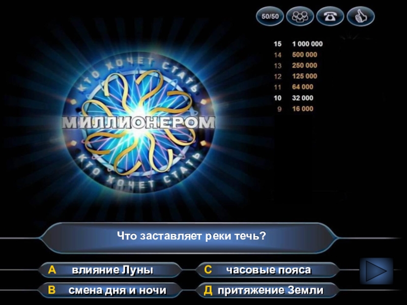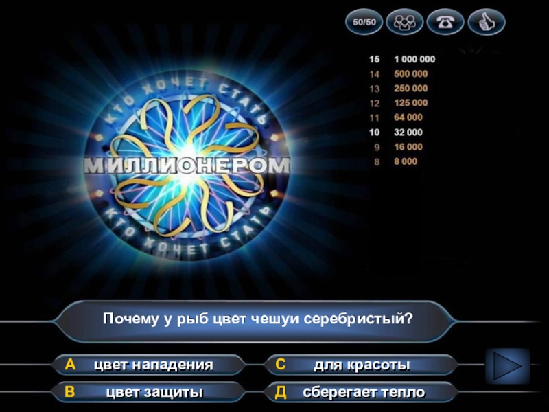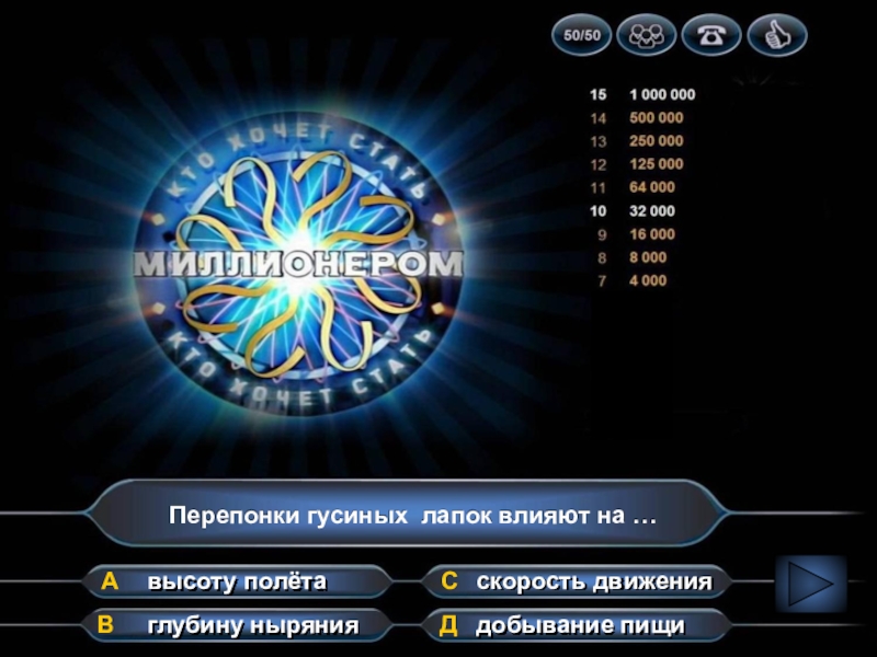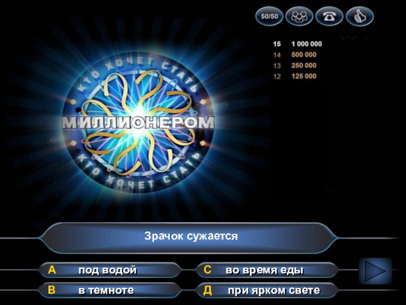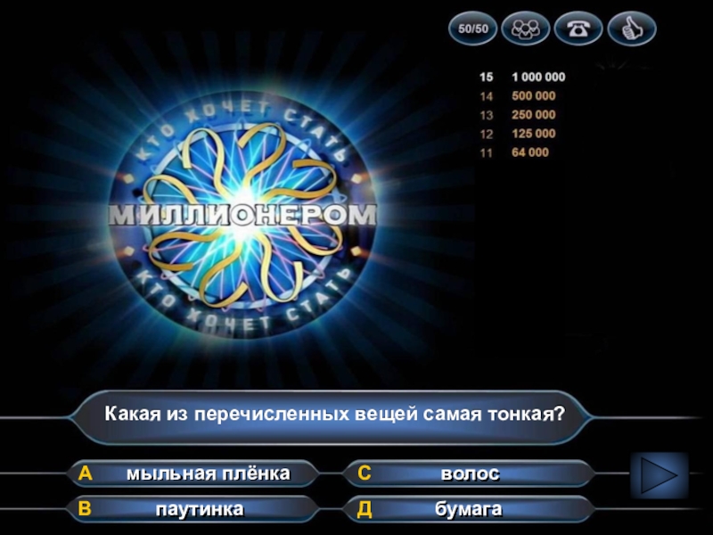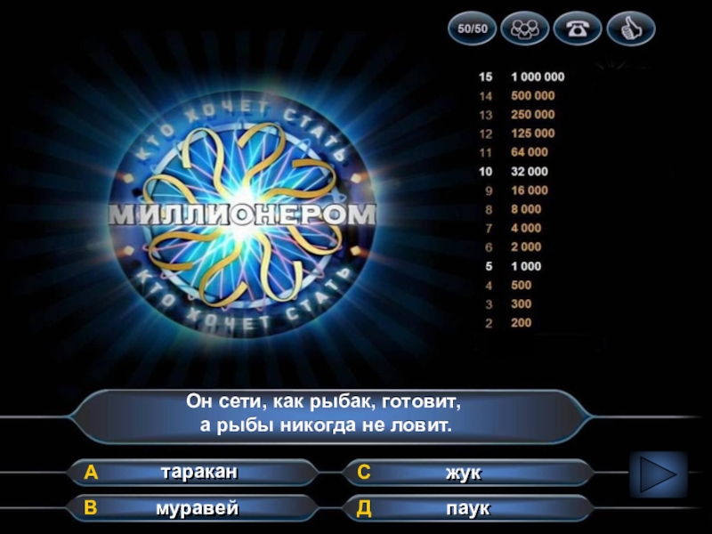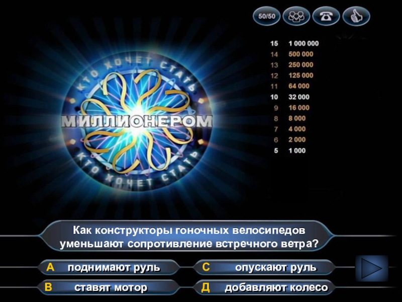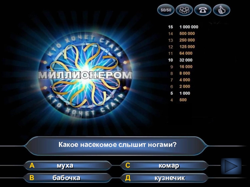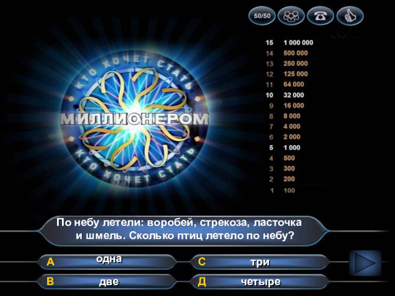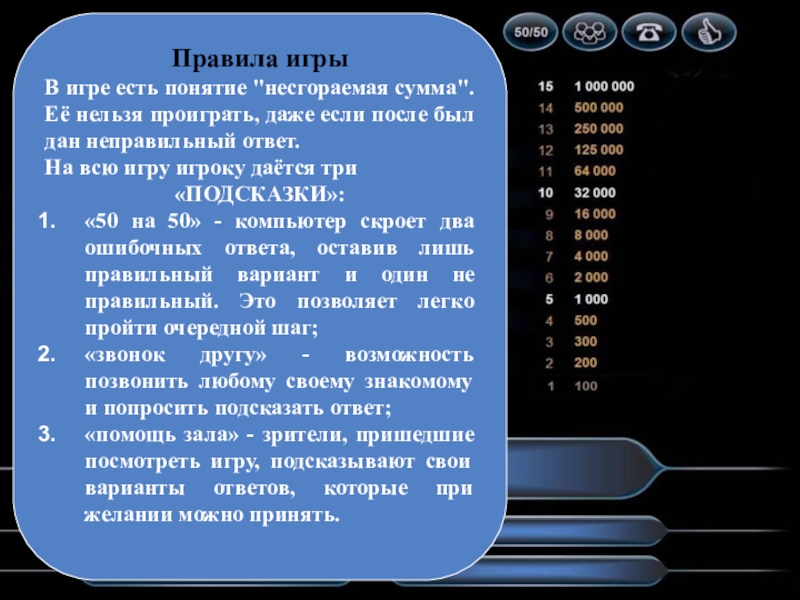 «50 на 50» - компьютер скроет два ошибочных ответа, оставив лишь правильный вариант и один не правильный. Это позволяет легко пройти очередной шаг;