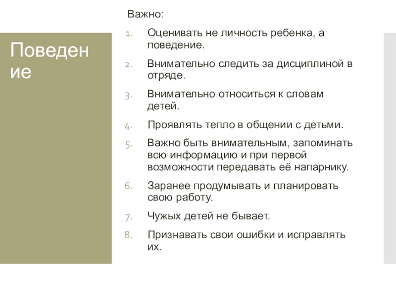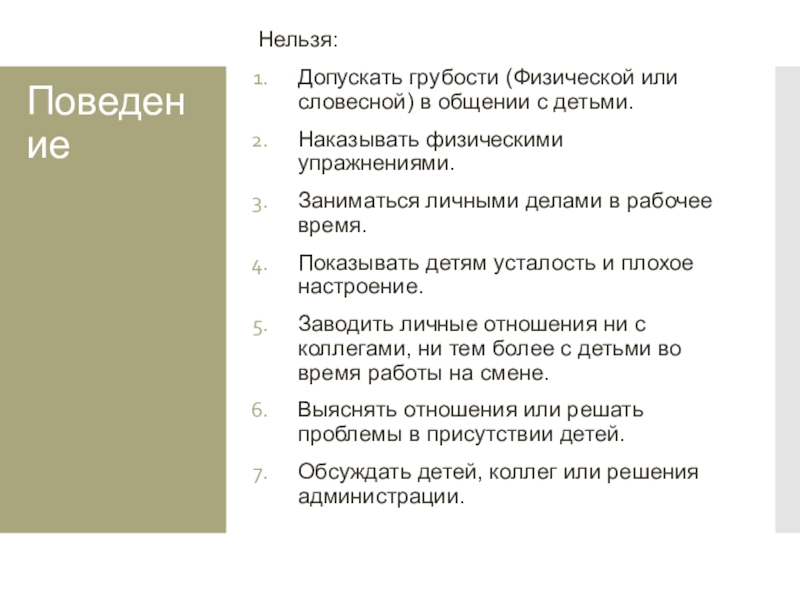 Заводить личные отношения ни с коллегами, ни тем более с детьми во время работы на смене.