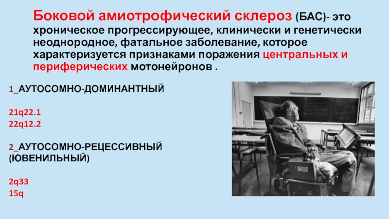 Слайд 10Боковой амиотрофический склероз (БАС)- это хроническое прогрессирующее, клинически и генетически