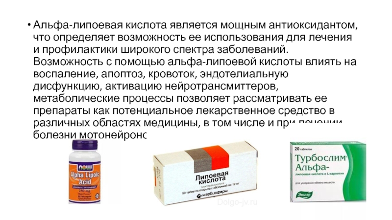 альфа-липоевой кислоты влиять на воспаление, апоптоз, кровоток, эндотелиальную дисфункцию, активацию нейротрансмиттеров, метаболические процессы позволяет рассматривать ее препараты как потенциальное лекарственное средство в различных областях медицины, в том числе и при лечении болезни мотонейронов.