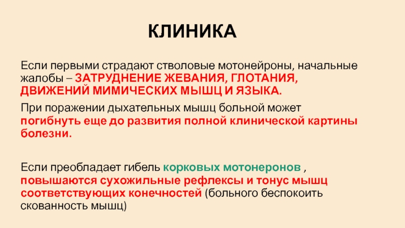 Если первыми страдают стволовые мотонейроны, начальные жалобы – ЗАТРУДНЕНИЕ