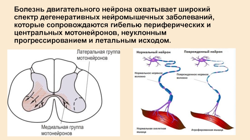 Слайд 2Болезнь двигательного нейрона охватывает широкий спектр дегенеративных нейромышечных заболеваний, которые