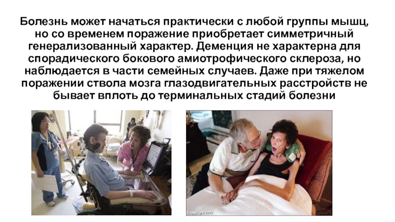 Слайд 23Болезнь может начаться практически с любой группы мышц, но со