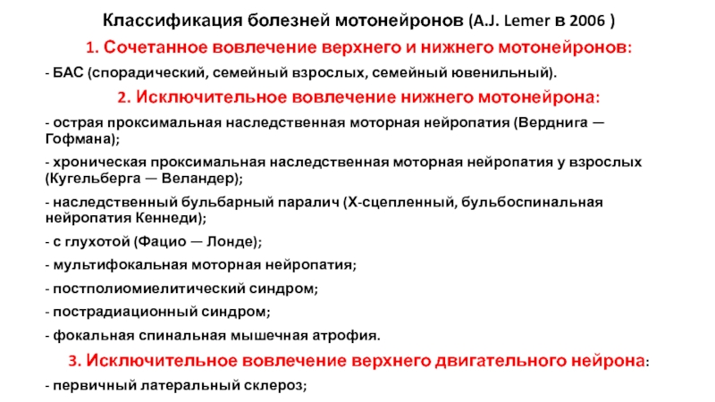 Слайд 7Классификация болезней мотонейронов (A.J. Lemer в 2006 )