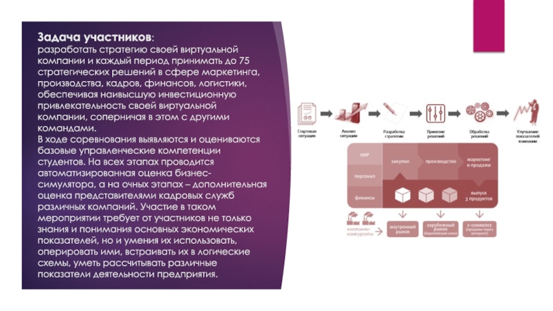 В Кубке "Управляй!" команды участников получают в управление виртуальные компании с одинаковыми стартовыми показателями, разрабатывают стратегию и комплекс управленческих решений по ее реализации в прямой конкуренции друг с другом в моделируемой экономике и рынках.