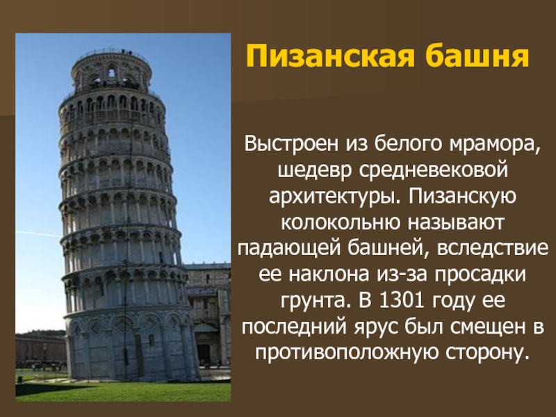 Пизанская башняВыстроен из белого мрамора, шедевр средневековой архитектуры. Пизанскую колокольню называют падающей башней, вследствие ее наклона из-за