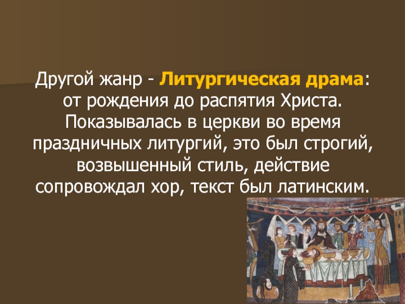 Другой жанр - Литургическая драма: от рождения до распятия Христа. Показывалась в церкви во время праздничных литургий,