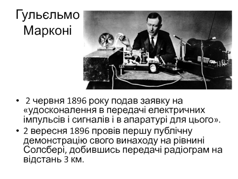 2 вересня 1896 провів першу публічну демонстрацію свого винаходу на рівнині Солсбері, добившись передачі радіограм на відстань 3 км.