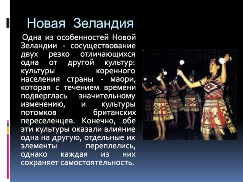 маори, которая с течением времени подверглась значительному изменению, и культуры потомков британских переселенцев. Конечно, обе эти культуры оказали влияние одна на другую, отдельные их элементы переплелись, однако каждая из них сохраняет самостоятельность.