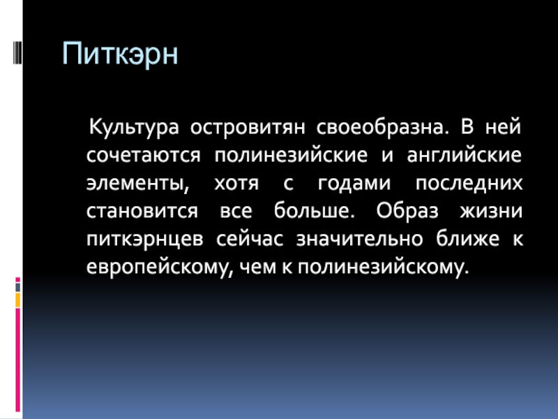 Культура островитян своеобразна. В ней сочетаются полинезийские и английские элементы,