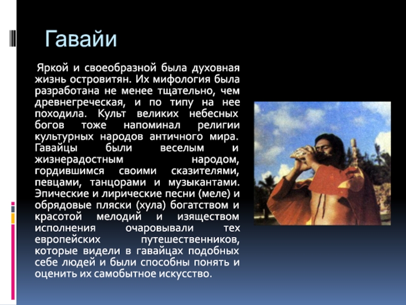 нее походила. Культ великих небесных богов тоже напоминал религии культурных народов античного мира. Гавайцы были веселым и жизнерадостным народом, гордившимся своими сказителями, певцами, танцорами и музыкантами. Эпические и лирические песни (меле) и обрядовые пляски (хула) богатством и красотой мелодий и изяществом исполнения очаровывали тех европейских путешественников, которые видели в гавайцах подобных себе людей и были способны понять и оценить их самобытное искусство.