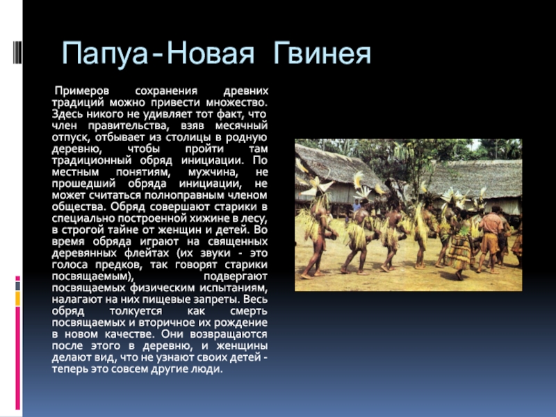 отбывает из столицы в родную деревню, чтобы пройти там традиционный обряд инициации. По местным понятиям, мужчина, не прошедший обряда инициации, не может считаться полноправным членом общества. Обряд совершают старики в специально построенной хижине в лесу, в строгой тайне от женщин и детей. Во время обряда играют на священных деревянных флейтах (их звуки - это голоса предков, так говорят старики посвящаемым), подвергают посвящаемых физическим испытаниям, налагают на них пищевые запреты. Весь обряд толкуется как смерть посвящаемых и вторичное их рождение в новом качестве. Они возвращаются после этого в деревню, и женщины делают вид, что не узнают своих детей - теперь это совсем другие люди.