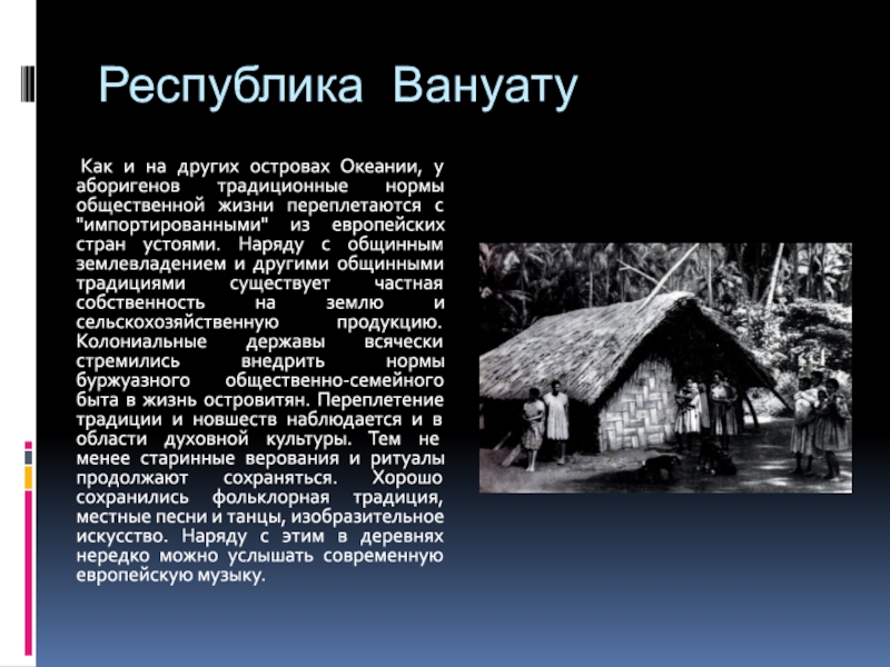 общины, занимающие в деревнях особые кварталы. Все местные дела по-прежнему обсуждаются и решаются в деревенском доме собраний (манеаба), где устраивают также празднества, принимают почетных гостей. Но власть традиционных вождей уходит в прошлое. В быт островитян, особенно молодого поколения, все более проникают западные струнные музыкальные инструменты, песни и танцы. Но на празднествах все еще исполняются "языческие" песни и пляски, которые не смогли искоренить миссионеры. В каждой деревне есть знатоки тунгаруанских легенд и преданий, передаваемых из поколения в поколение.