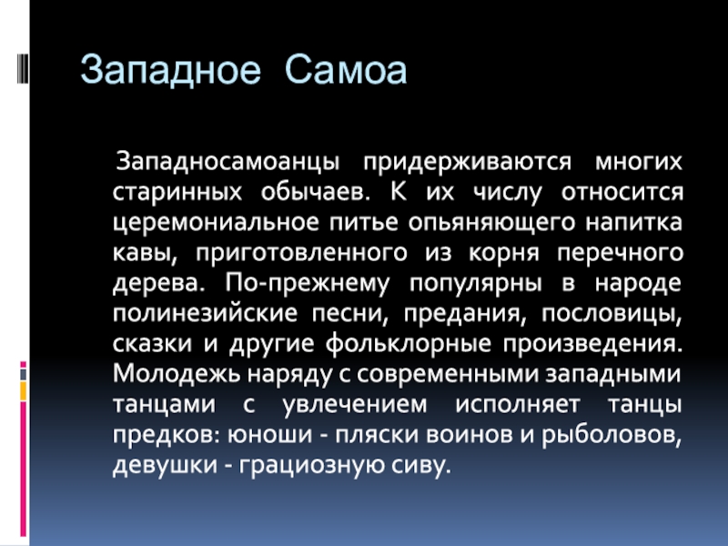Западносамоанцы придерживаются многих старинных обычаев. К их числу относится