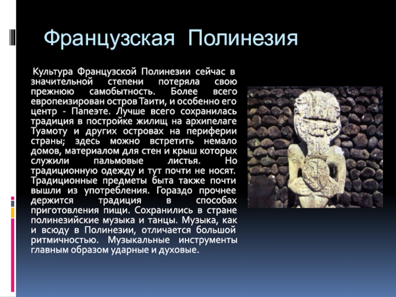 центр - Папеэте. Лучше всего сохранилась традиция в постройке жилищ на архипелаге Туамоту и других островах на периферии страны; здесь можно встретить немало домов, материалом для стен и крыш которых служили пальмовые листья. Но традиционную одежду и тут почти не носят. Традиционные предметы быта также почти вышли из употребления. Гораздо прочнее держится традиция в способах приготовления пищи. Сохранились в стране полинезийские музыка и танцы. Музыка, как и всюду в Полинезии, отличается большой ритмичностью. Музыкальные инструменты главным образом ударные и духовые.