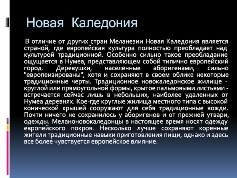 сильно такое преобладание ощущается в Нумеа, представляющем собой типично европейский город. Деревушки, населенные аборигенами, сильно "европеизированы", хотя и сохраняют в своем облике некоторые традиционные черты. Традиционное новокаледонское жилище - круглой или прямоугольной формы, крытое пальмовыми листьями - встречается сейчас лишь в небольших, наиболее удаленных от Нумеа деревнях. Кое-где круглые жилища местного типа с высокой конической крышей сооружают для себя традиционные вожди. Почти ничего не сохранилось у аборигенов и от прежней утвари, одежды. Меланоновокаледонцы в настоящее время носят одежду европейского покроя. Несколько лучше сохраняют коренные жители традиционные навыки приготовления пищи, однако и здесь все более чувствуется европейское влияние.