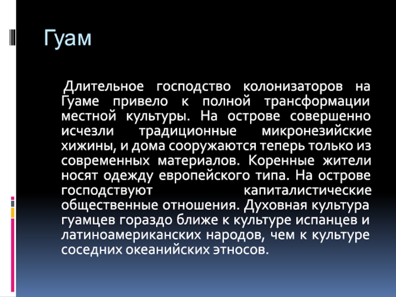 сооружаются теперь только из современных материалов. Коренные жители носят одежду европейского типа. На острове господствуют капиталистические общественные отношения. Духовная культура гуамцев гораздо ближе к культуре испанцев и латиноамериканских народов, чем к культуре соседних океанийских этносов.