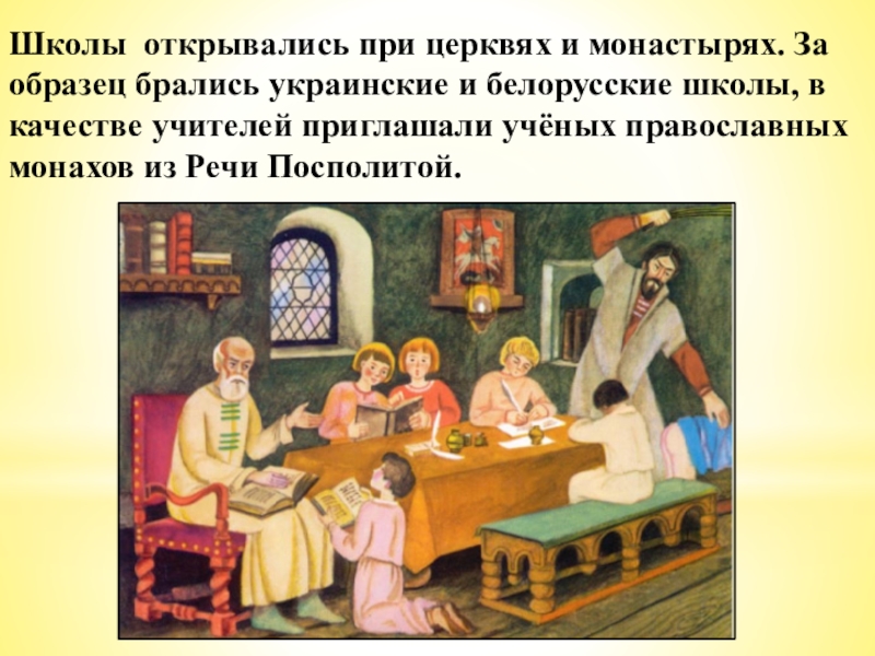 Слайд 11Школы открывались при церквях и монастырях. За образец брались украинские