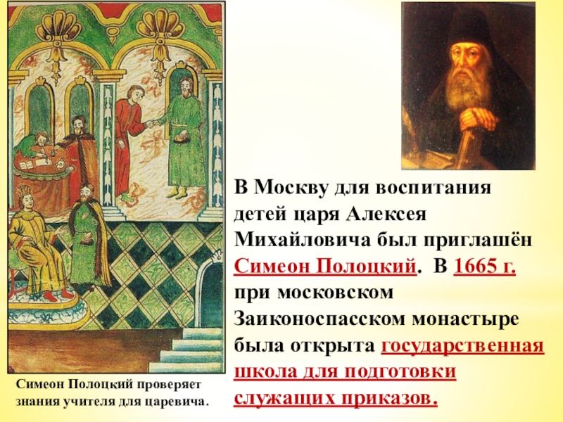 Симеон Полоцкий проверяет знания учителя для царевича.