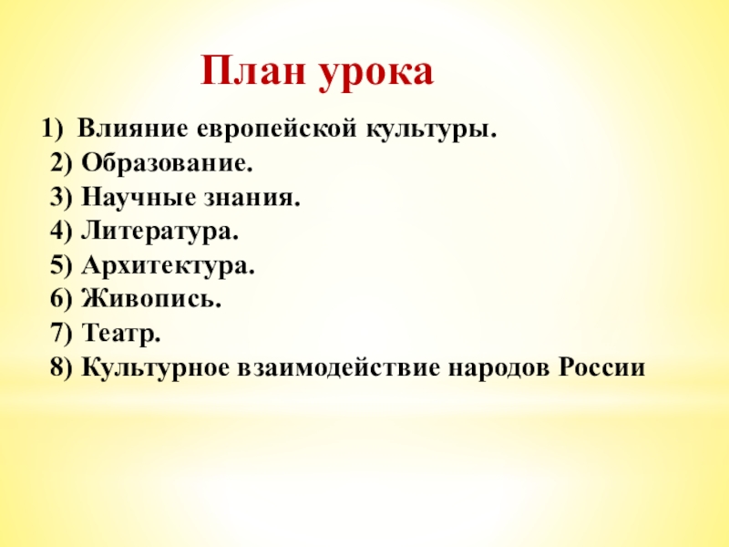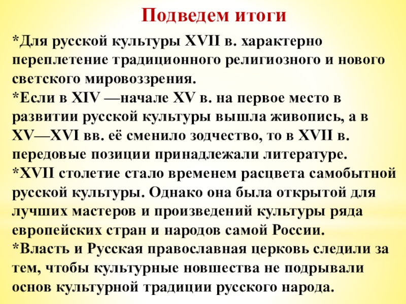 *Власть и Русская православная церковь следили за тем, чтобы культурные новшества не подрывали основ культурной традиции русского народа.