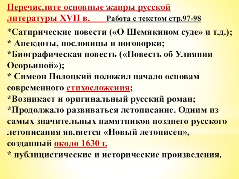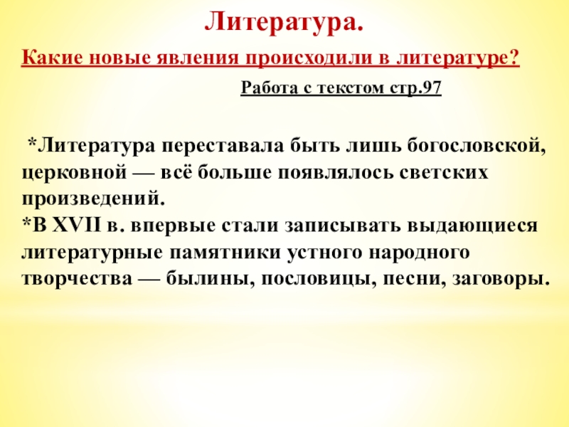 *В XVII в. впервые стали записывать выдающиеся литературные памятники устного народного творчества — былины, пословицы, песни, заговоры.