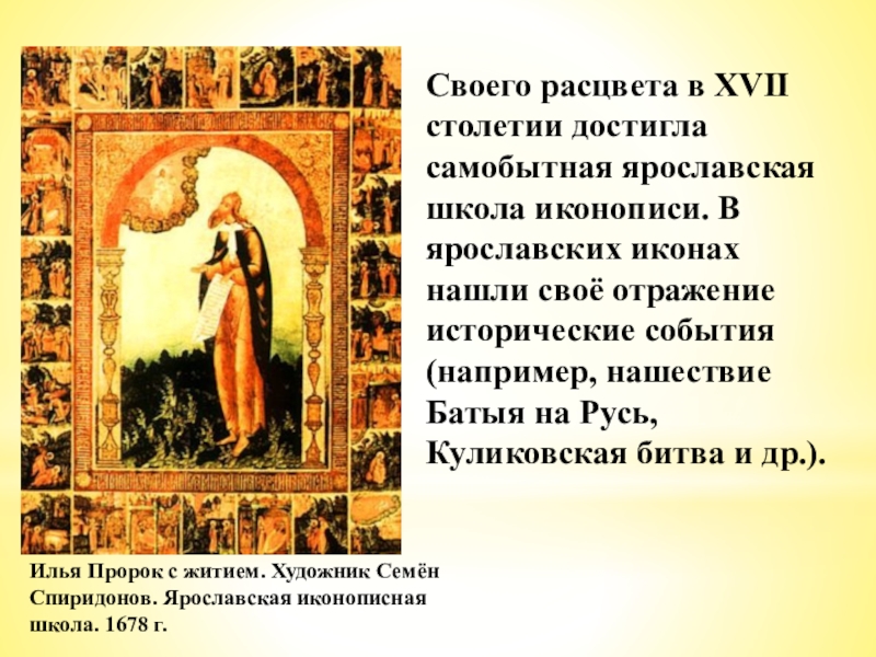 Илья Пророк с житием. Художник Семён Спиридонов. Ярославская иконописная школа. 1678 г.