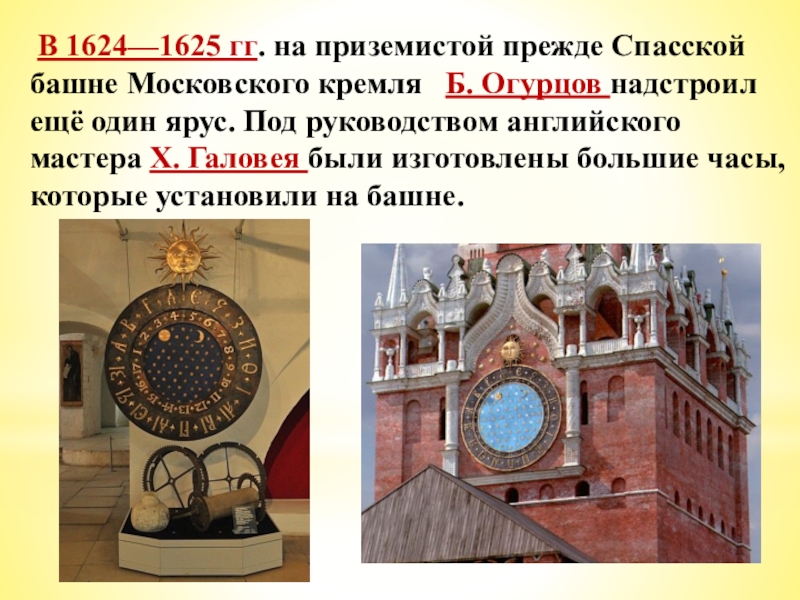 Слайд 30 В 1624—1625 гг. на приземистой прежде Спасской башне Московского