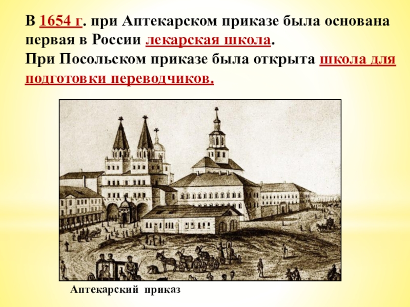 Слайд 9В 1654 г. при Аптекарском приказе была основана первая в