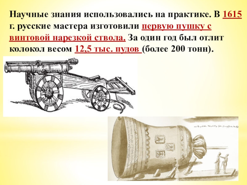 Слайд 20Научные знания использовались на практике. В 1615 г. русские мастера