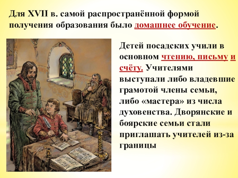 Для XVII в. самой распространённой формой получения образования было домашнее обучение.