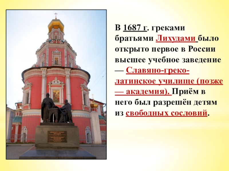 Слайд 14В 1687 г. греками братьями Лихудами было открыто первое в