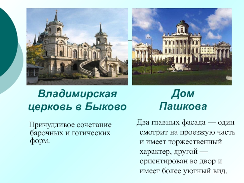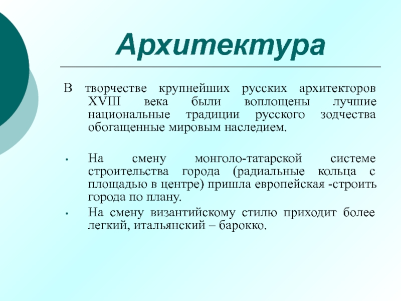 В творчестве крупнейших русских архитекторов XVIII века были воплощены лучшие