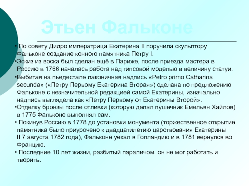 Слайд 34 По совету Дидро императрица Екатерина II поручила скульптору Фальконе создание конного