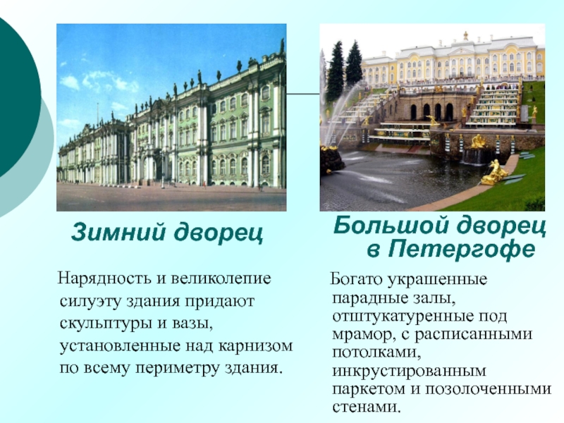 архитектурных форм, выразительный ритм колоннад, активное включение скульптуры в декор.