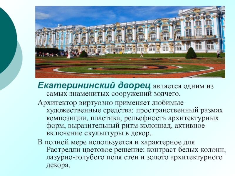 Слайд 9Екатерининский дворец является одним из самых знаменитых сооружений зодчего.