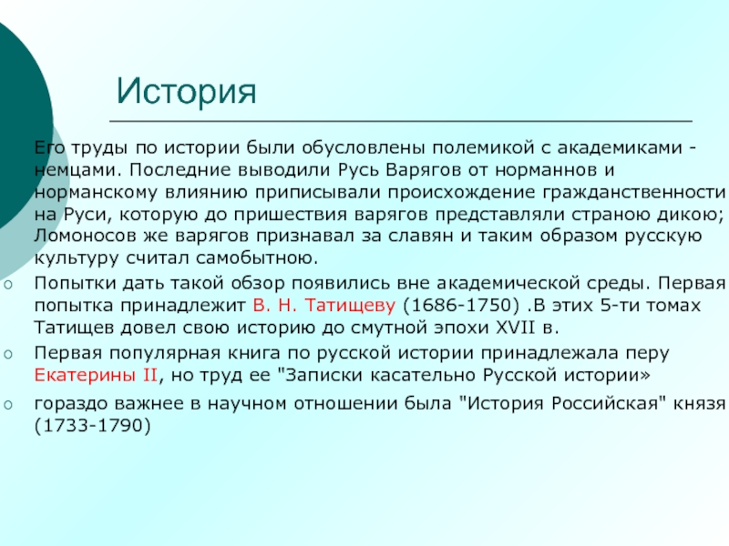 приписывали происхождение гражданственности на Руси, которую до пришествия варягов представляли страною дикою; Ломоносов же варягов признавал за славян и таким образом русскую культуру считал самобытною.